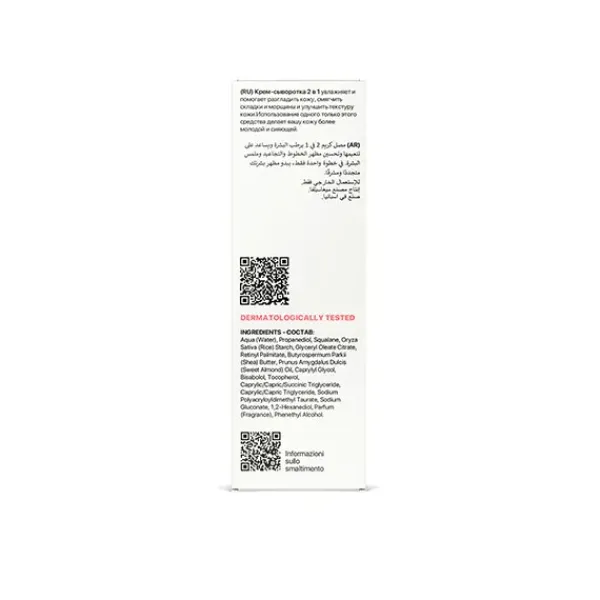 Sérum Crema 2 en 1 con pro-retinol al 0,3% (un precursor del Retinol), ayuda a estimular la síntesis de colágeno y a mejorar la regeneración celular para difuminar las arrugas, al mismo tiempo que hidrata, nutre y aporta confort a tu rostro.
