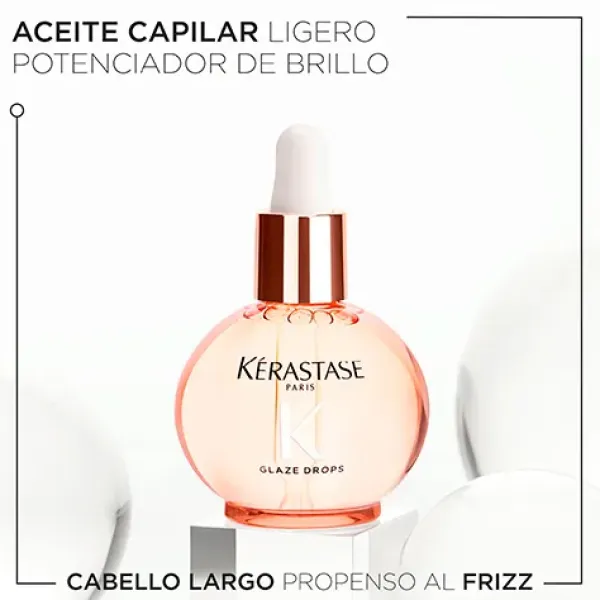 Glaze Drops de Kerastase es un aceite capilar ligero para cabello largo con tendencia al encrespamiento, que busca suavidad y brillo intenso. Está especialmente formulado con aceite de rosa silvestre para un cabello glossy: suave, con brillo y ligero.