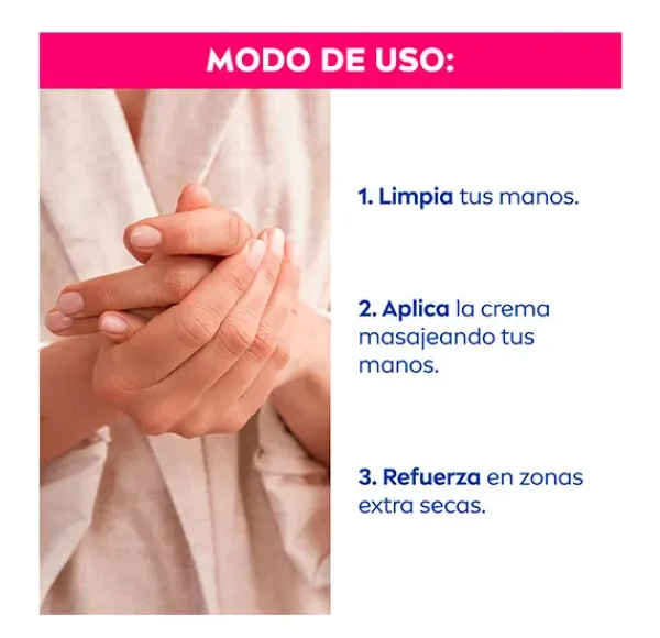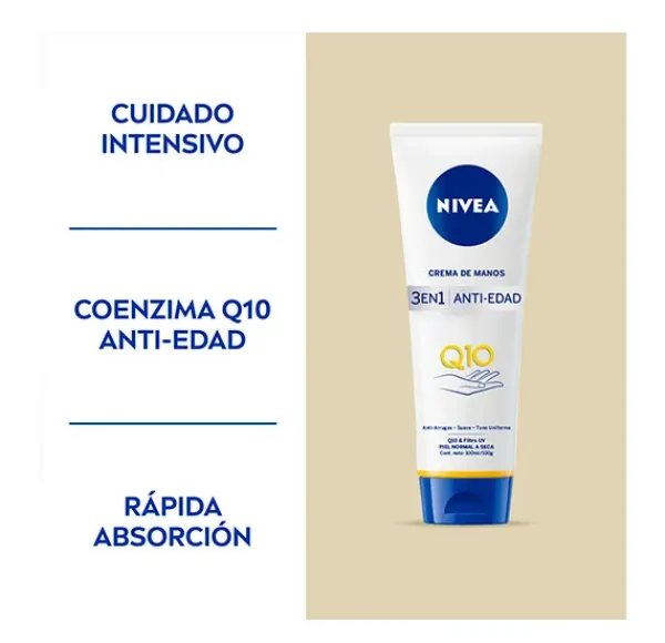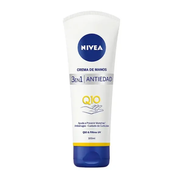 La fórmula antiarrugas de NIVEA Q10 Crema de Manos Antiedad 3 en 1, enriquecida con Coenzima Q10 y filtros UV, ayuda a prevenir y reducir visiblemente los signos prematuros de la edad y la aparición de manchas debidas a la radiación solar. Ha sido testada y probada para conseguir resultados eficaces en la piel de las manos. Con una agradable textura de rápida absorción, además, cuida las cutículas con su uso diario y regular. Estimula la producción de energía de la piel mejorando su capacidad para mantenerse suave y firme.