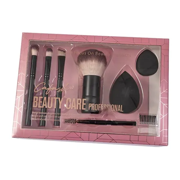 Contiene brocha facial, 2 pinceles para aplicar sombras, 1 pincel para delinear, 2 esponjas para maquillaje y corrector y un pincel doble para pestañas y cejas.