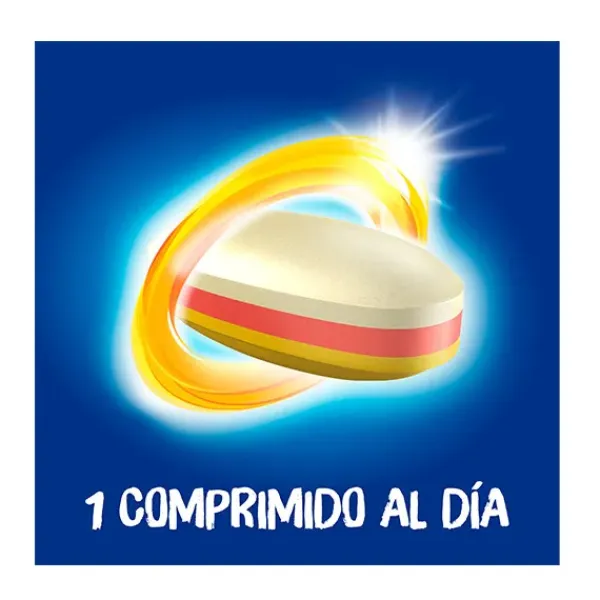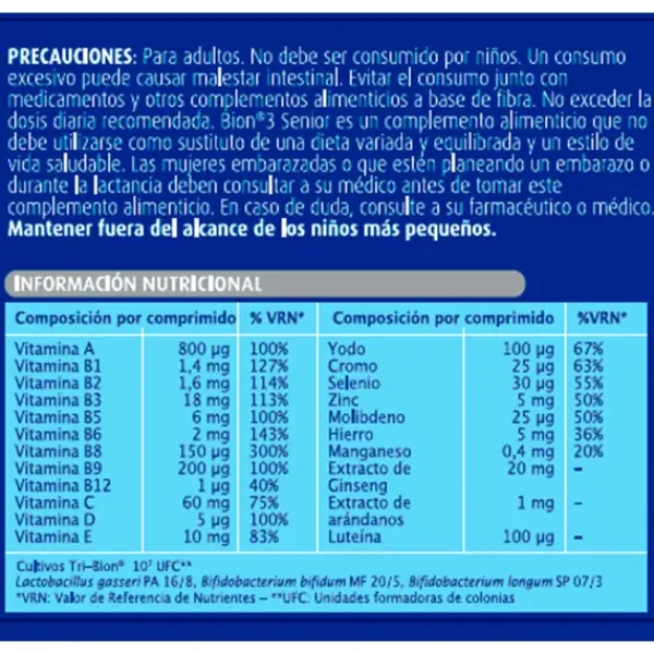 Bion3 Senior con multivitaminas y minerales, aporta 12 vitaminas, incluyendo la vitamina D, que contribuye al funcionamiento normal del sistema inmunitario; 7 minerales, como el hierro, que ayuda a disminuir el cansancio y la fatiga; además de ginseng, luteína y extracto de arándanos.
