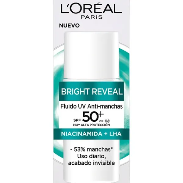 Despierta la luminosidad de tu piel con el Bright Reveal Fluido Hidratante Anti-manchas con Filtro UV SPF50+ y Niacinamida de L’Oréal Paris. Este innovador Fluido diario, de alta protección solar, protege, ayuda a prevenir y corrige visiblemente las manchas.