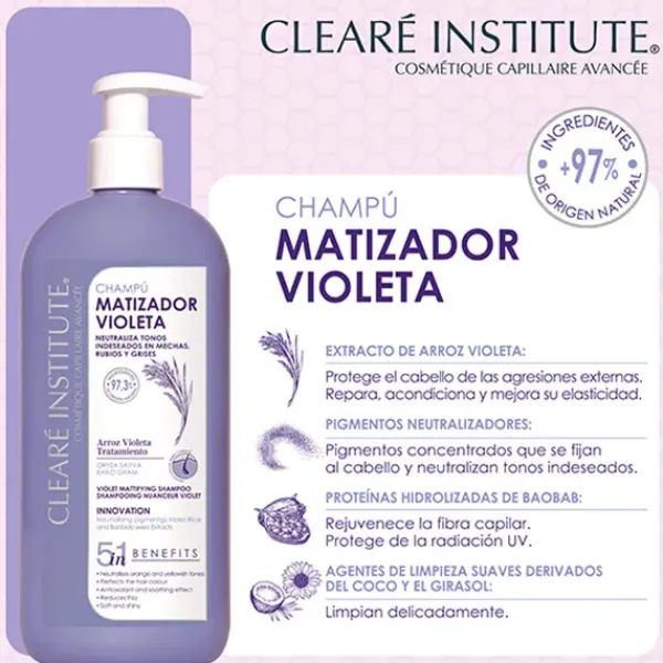El Champú Matizador Violeta de Clearé Institute, es un tratamiento que atenúa los tonos amarillentos e ilumina el cabello, eliminando tonos indeseados.