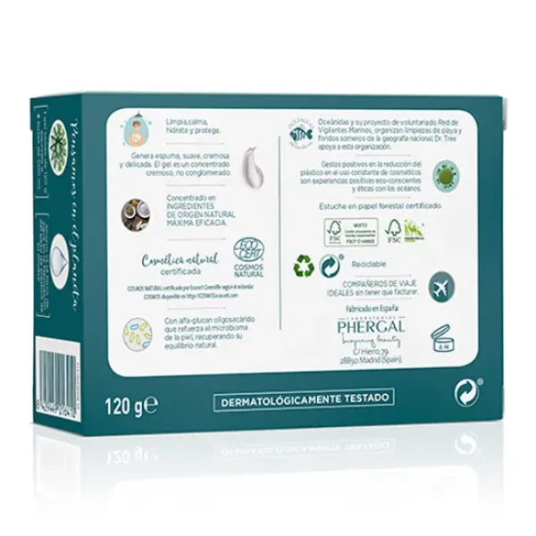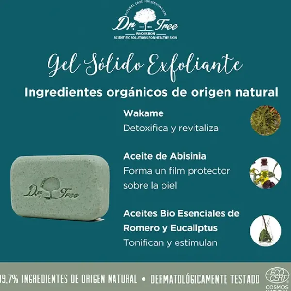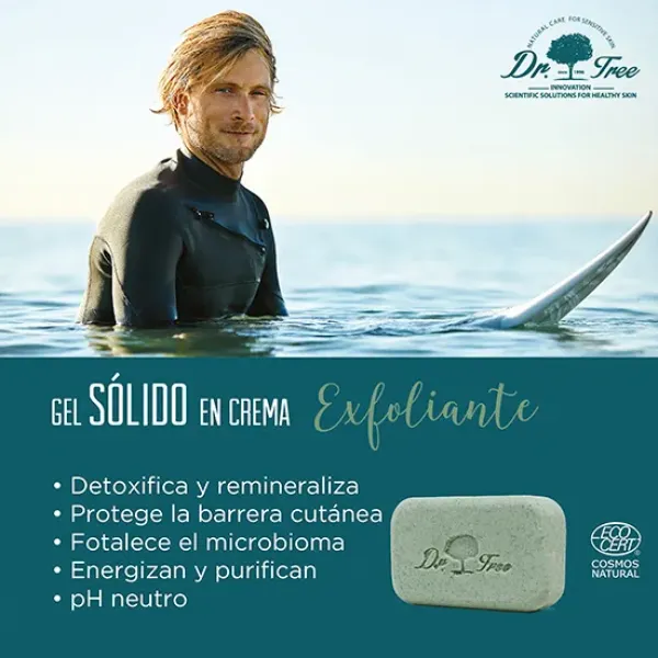 Gel de ducha sólido exfoliante detox piel sensible a base de un concentrado de tensioactivos de origen natural suaves y cremosos que forman una espuma densa y lujosa, limpiando suavemente la piel y reforzando su microbioma con alfa-glugan oligosacarido, recuperando su equilibrio natural y bioestimulante de las defensas naturales.