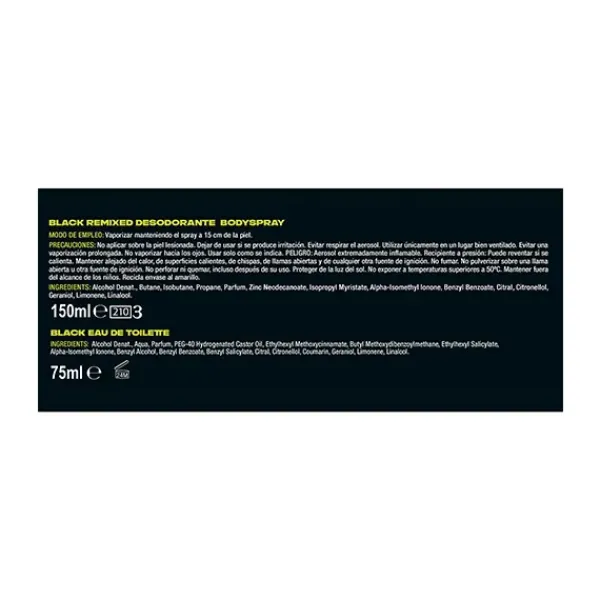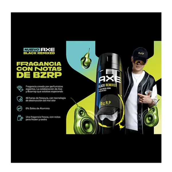 AXE BLACK REMIXED DESODORANTE BODY SPRAY BZRP: Huele irresistiblemente fresco con el nuevo AXE BLACK REMIXED: una fragancia con notas de BZRP. El nuevo Axe Black Remixed es un body spray que te da una explosión de aromas frescos, incluyendo notas de pera frozen y cedro. Además, ofrece 48 horas de protección contra el mal olor. Este lanzamiento junto a Bizarrap la convierte en una de las mejores fragancias de Axe en el mercado.