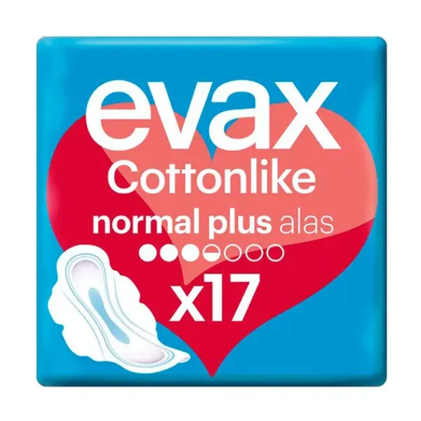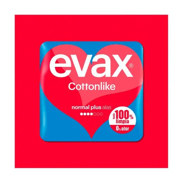 Las compresas Evax Cottonlike absorben el flujo menstrual y te ayudan a mantenerte totalmente limpia y sin rastro de olor. El Sistema Evax Cottonlike Dual incorpora unas perlas activas que neutralizan el olor y su núcleo superabsorbente captura el flujo menstrual al instante. De larga duración, con alas para mantenerse en su sitio y una cobertura Cottonlike para mayor suavidad, estas compresas harán que te sientas cómoda y te permitirán seguir con tu día sin interrupciones. Disponibles en diferentes niveles de absorción: Normal y Normal Plus para los días de flujo leve o normal; Super y Super Plus para los días de flujo abundante o muy abundante.