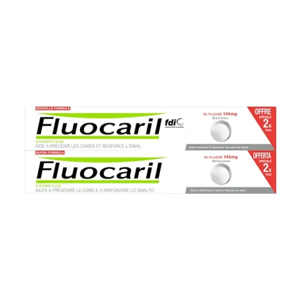 Fluocaril Dentífrico Blanqueador Bi-Fluor Lote de 2 x 75 ml es un dentífrico bi-fluorado que ayuda a prevenir las caries, fortalece el esmalte y ayuda a recuperar el blanco natural de los dientes.
