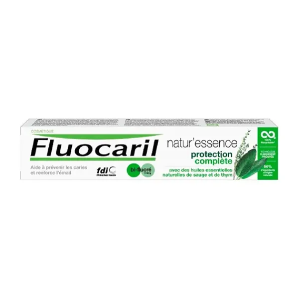 Fluocaril Natur Essence Bi-Fluore Cuidado Completo es una pasta de dientes especialmente desarrollada para fortalecer los dientes y proteger las encías. Ofrece una protección completa para su boca con un 96% ingredientes de origen natural.