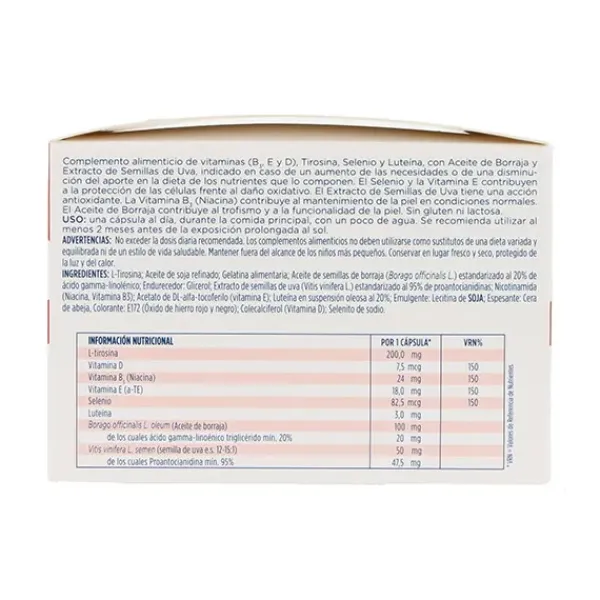 Complemento alimenticio a base de vitaminas (B3, E y D), tirosina, selenio y luteína, con aceite de borraja y extracto de pepita de uva, indicado en caso de aumento de necesidades o disminución de la ingesta con la dieta de los nutrientes que la componen. El selenio y la vitamina E contribuyen a la protección de las células del estrés oxidativo que puede causarse incluso por la exposición al sol. El extracto de semilla de uva tiene una acción antioxidante. La vitamina B3 y el aceite de borraja ayudan a mantener la piel sana.