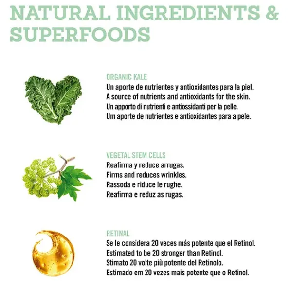 – RETINAL: activo considerado 20 veces más potente que el retinol para tratar las finas líneas y arrugas, la pigmentación y la textura desigual.