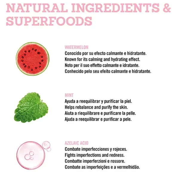 – SANDÍA: fuente natural de hidratación, vitaminas y antioxidantes para ayudar a calmar la piel.