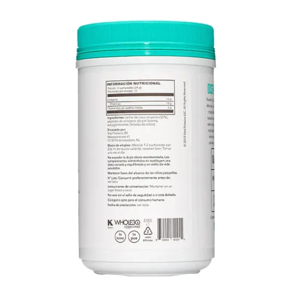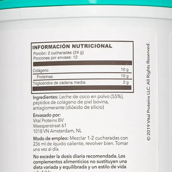 Cuenta con grasas saludables de leche de coco orgánica, además de 10 gramos de péptidos de colágeno, extraídos de la piel de vacas criadas en libertad y alimentadas sólo con pasto.