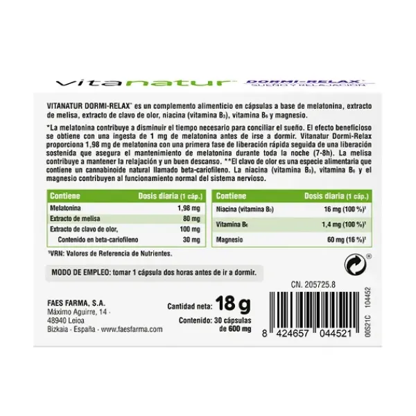 Vitanatur Dormi-Relax* es un complemento alimenticio que combina la acción sobre el sueño de la melatonina, con un cannabinoide natural procedente del clavo de olor y un extracto de melisa que contribuye a mantener la relajación.