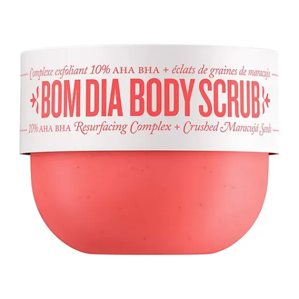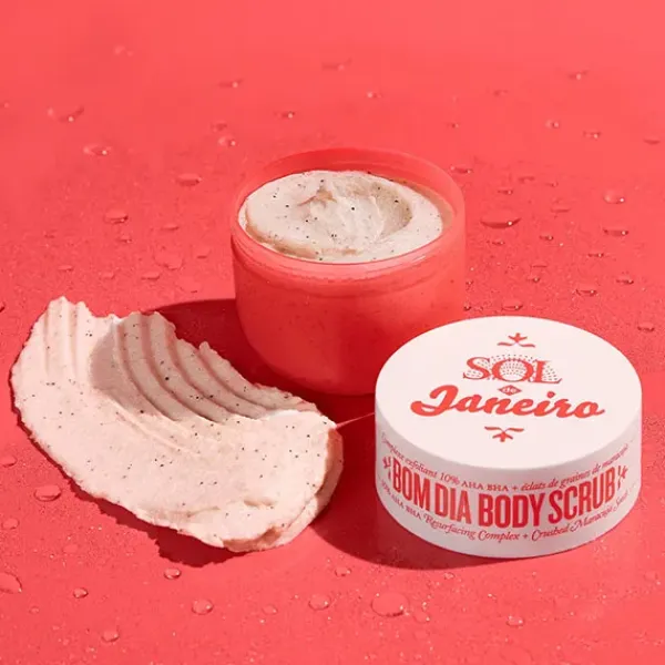 Exfoliante corporal Bom Dia: Un exfoliante corporal enriquecido con un complejo rejuvenecedor que contiene un 10 % de AHA BHA para mejorar visiblemente la claridad, el tono y la textura de la piel. Para una piel visiblemente radiante.