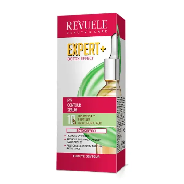 El suero Revuele Botox Effect contiene péptidos y ácido hialurónico que calman la delicada piel alrededor de los ojos, para reducir la hinchazón y la apariencia de las ojeras.