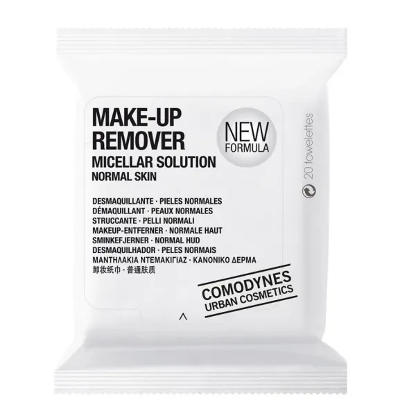 Cada toallita MAKE-UP REMOVER NORMAL SKIN contiene un tratamiento micelar de limpieza completo. Una sola dosis sustituye la acción de la leche limpiadora, el tónico facial y el desmaquillante de ojos. Efecto 3 en 1 para una limpieza completa en un sólo gesto. Las toallitas extra-suaves de viscosa 100% están humedecidas con una solución micelar (agua micelar) a pH iso-lagrimale, de excelente tolerancia dérmica y ocular, que elimina las impurezas y restos de maquillaje dejando la piel de la cara limpia y con una agradable sensación de frescor y bienestar. Tanto su material, como la particular forma en que está confeccionado, permiten una perfecta incorporación y retención de su fórmula exclusiva para desmaquillar y una acción ligeramente exfoliante por arrastre.