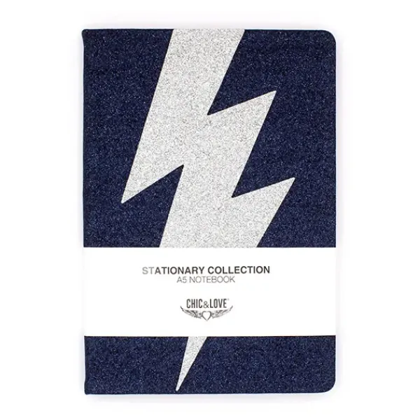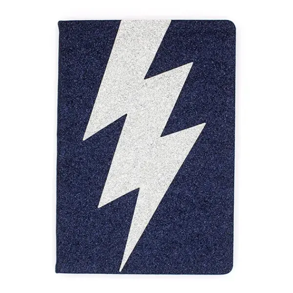 Cuaderno purpurina azul, con rayo en purpurina plateada, tamaño A5 con interior en líneas.