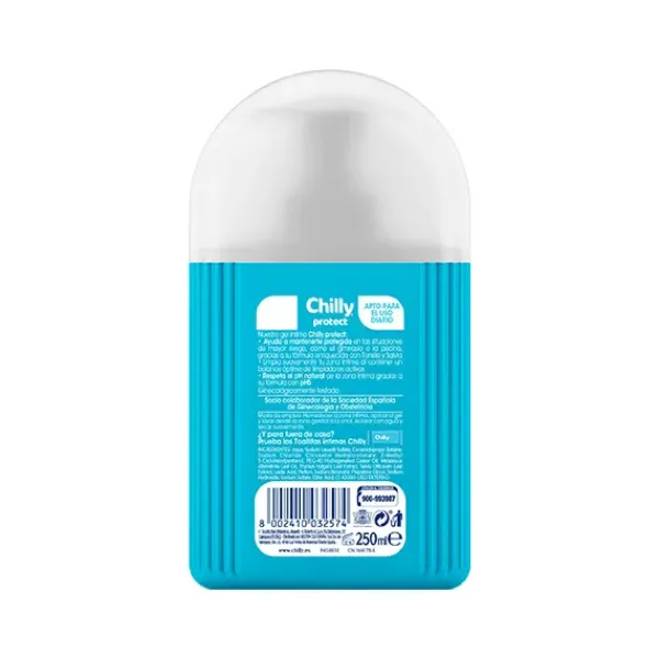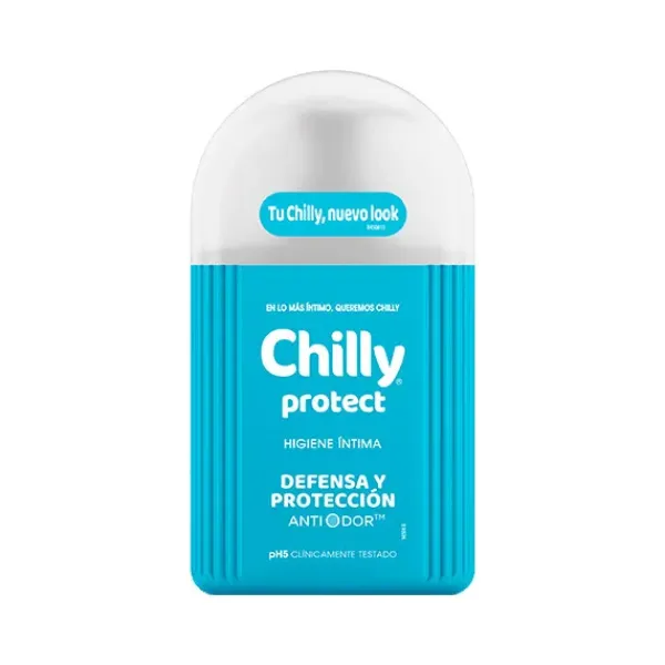 Chilly Protect: Es el gel de higiene íntima que proporciona defensa y protección para la zona íntima. Fórmula activa, enriquecida con extracto de Tomillo y Salvia, favorece la acción protectora frente a agentes externos y ayuda a proteger la flora vaginal, que es la defensa natural de la zona íntima. Apto para el uso diario, es ideal durante el embarazo y cuando se frecuentan lugares con mayor exposición a gérmenes (piscinas, gimnasios, playas). Con pH 5.0, respeta el equilibrio natural fisiológico de las mucosas. Clínicamente testado.
