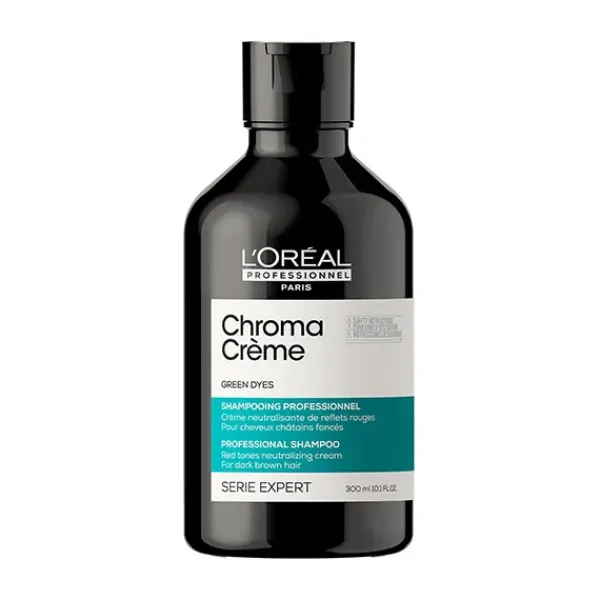 Chroma Crème es un trio de cremas neutralizantes de color que ofrecen corrección de color instantánea, a la medida para todos los colores de cabello con un máximo cuidado. El cabello recién coloreado contiene tintes de colores primarios.Después de unas lavadas, estos pigmentos desvanecen y reflejos cálidos amarillos, anaranjados o rojizos aparecen. Existe un mito urbano que dice que el champú morado neutraliza todos los tonos cálidos y mantiene el color. La realidad profesional es otra: el champú morado solo neutraliza los tonos amarillos en el cabello rubio. Por esto, para corregir reflejoscálidos indeseados, debes elegir la corrección de color adecuada. Como el verde neutraliza los reflejos rojizos, elige Chroma Crème verde para los cabellos castaños oscuros o negros. Chroma Crème verde instantáneamente neutraliza todos los reflejos rojizos indeseados, nutre la fibra sin añadir peso, para una corrección de color superior con el máximo cuidado.