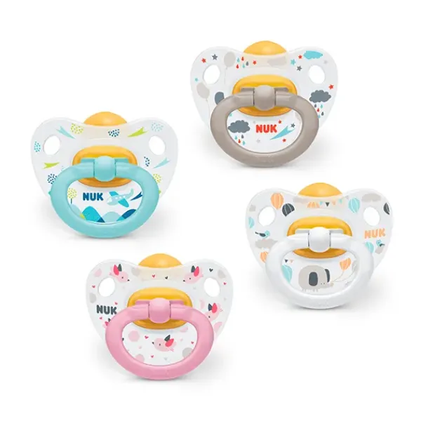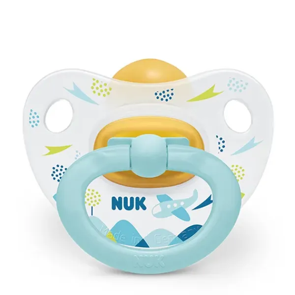 Su tetina de látex anatómica imita el pezón materno durante la lactancia y se adapta al paladar del bebé. El sistema de ventilación NUK AIR SYSTEM hace que el aire escape por la tetina, lo que permite que ésta permanezca suave y moldeable y previene la deformación de la mandíbula. El escudo cubre la boca con forma ergonómica. Caja portachupete higienizable de 1 ud. BPA Free.