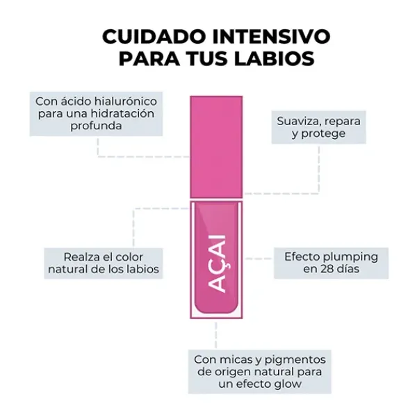 Aceite labial efecto glow y gloss con dulce olor a açai.