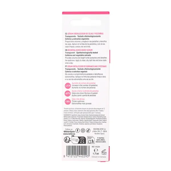 Tratamiento dual: potencia el volumen y la longitud de las pestañas, fortalece y densifica las cejas mediante su aplicación específica en esta área. Fórmula con 3,75% de ingredientes activos como cafeína, L-Arginina, ácido hialurónico y extractos vegetales.