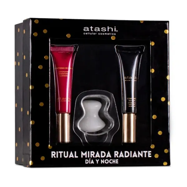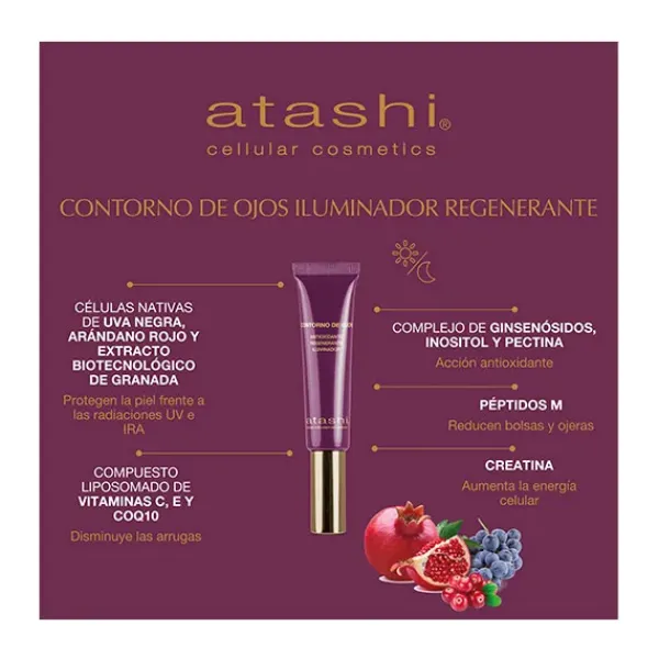 Atashi Contorno de ojos antioxidante que reduce bolsas y ojeras con Vitaminas C, E y Péptidos M. Refresca, nutre, corrige y reafirma la piel del contorno de los ojos con su fórmula antioxidante.