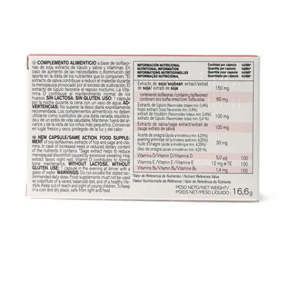 Complemento alimenticio a base de isoflavonas de soja, extracto de lúpulo, salvia y vitaminas.