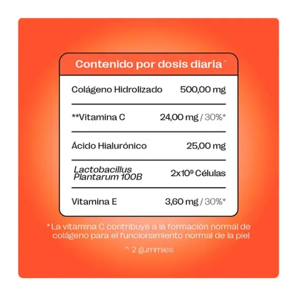 Colágeno + Ácido hialurónico + Probióticos + Vitamina E y C.