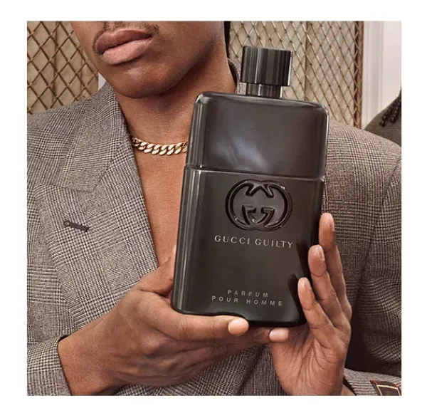 GUCCI Guilty Pour Homme Parfum una nueva fragancia donde se realza el aroma intenso con el cuál se alejada de las reglas y convenciones de la sociedad. Es una fragancia de la familia ámbar amaderada en el cuál reeinterpreta la esencia del perfume clásico de Gucci Guilty Pour Homme. Su frasco se presenta en un envase totalmente metalizado, que se realza con un acabado en antracita oscuro y un tapón del mismo color.