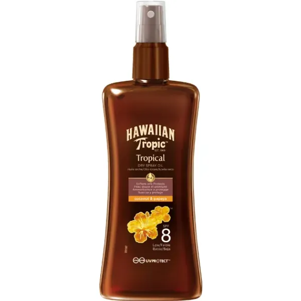 El aceite seco en spray de Hawaiian Tropic proporciona tacto y el icónico aroma de aceite tradicional en un formato de fácil aplicación.