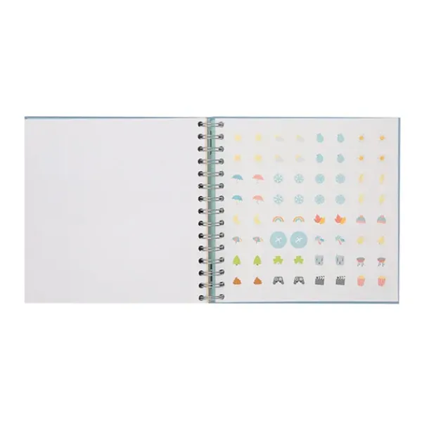 - Con tapa dura, 115 páginas de 100 gr y 4 hojas de pegatinas.