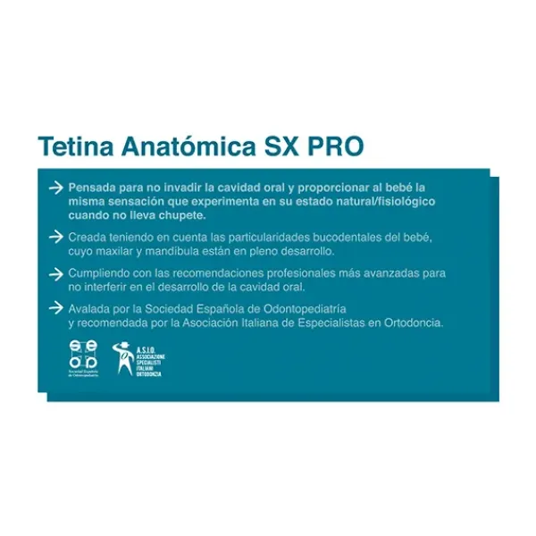 La Tetina Suavinex SX Pro está Avalada por la Sociedad Española de Odontopediatría y recomendada por la Asociación Italiana de Especialistas en Ortodoncia. Novedades de la tetina Anatómica SX Pro: