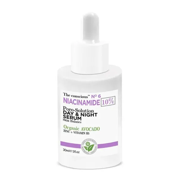 The conscious sérum de día y de noche ayuda equilibrar la piel con niacinamida, zinc y aceite de aguacate orgánico para disminuir la apariencia de imperfecciones y poros para una tez limpia, fresca y purificada.