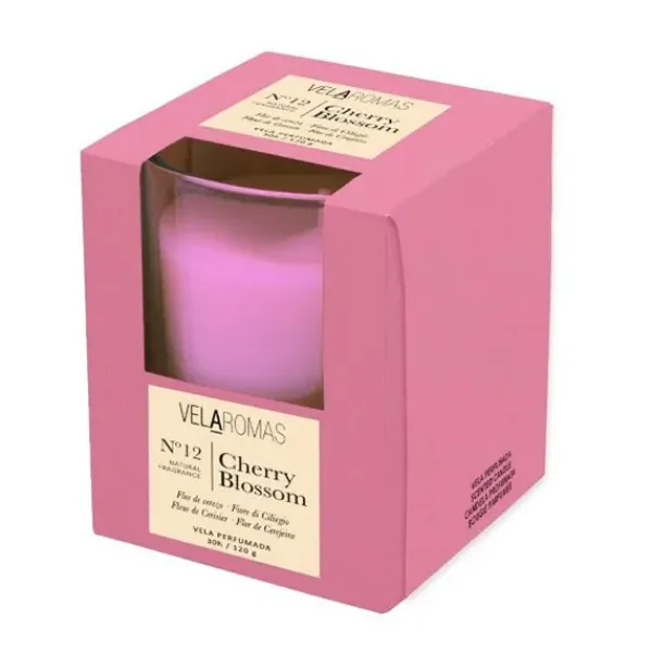 Vela de cera vegetal con fragancia Cerezo en Flor. Presentada en vaso de cristal 100% reciclable. El perfume natural de Cherry Blossom o Flor de Cerezo aporta beneficios aromáticos enfocados a revitalizar nuestro estado mental y calmar el estrés y la ansiedad.