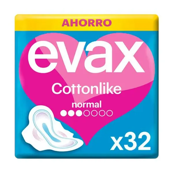 Las compresas Evax Cottonlike absorben el flujo menstrual y te ayudan a mantenerte totalmente limpia y sin rastro de olor. El Sistema Evax Cottonlike Dual incorpora unas perlas activas que neutralizan el olor y su núcleo superabsorbente captura el flujo menstrual al instante. De larga duración, con alas para mantenerse en su sitio y una cobertura Cottonlike para mayor suavidad, estas compresas harán que te sientas cómoda y te permitirán seguir con tu día sin interrupciones. Disponibles en diferentes niveles de absorción: Normal y Normal Plus para los días de flujo leve o normal; Super y Super Plus para los días de flujo abundante o muy abundante.