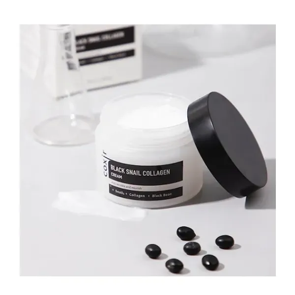 Crema facial formulada con extracto de baba de caracol, colágeno y extracto de ingredientes de color negro como frijol negro, sésamo negro y arroz negro que tiene efectos antioxidantes.