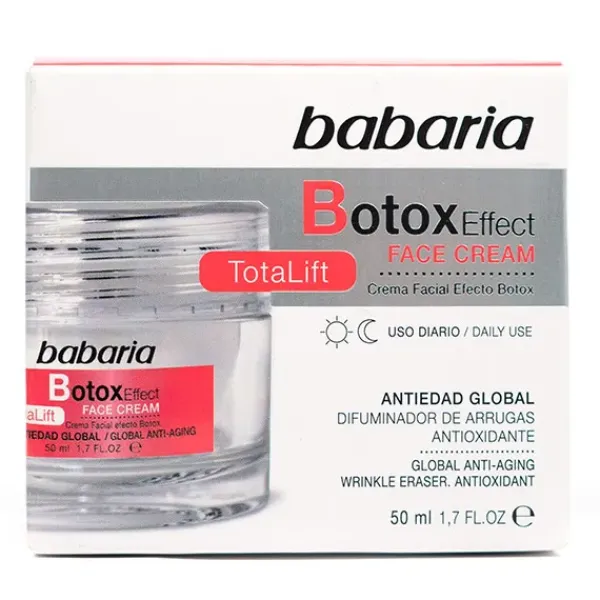 La crema facial Botox Effect de Babaria proporciona un efecto antiedad global. Formulada con un Tripéptido Botox-like, difumina las arrugas y aporta acción antioxidante. Especialmente indicado para piel madura.