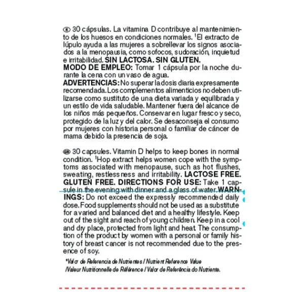 Contiene Extracto de Lúpulo Lifenol®, Isoflavonas de soja, Rosa Centifolia, Aceite de Onagra, Vitamina B6, E y D3.