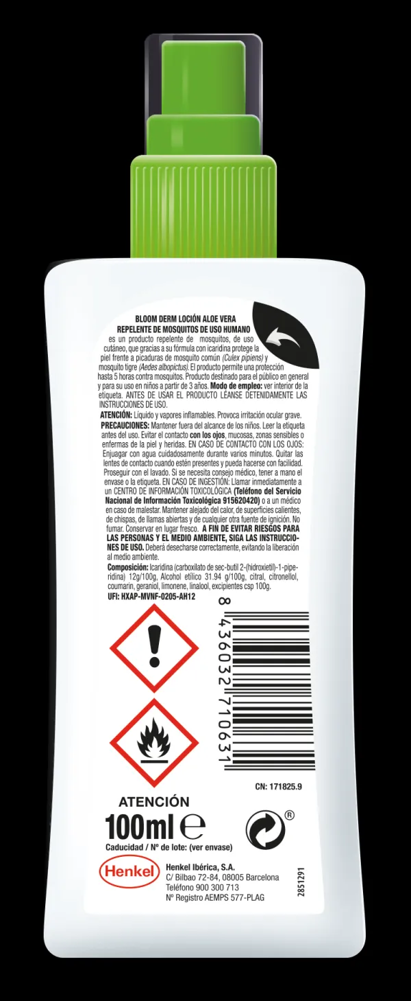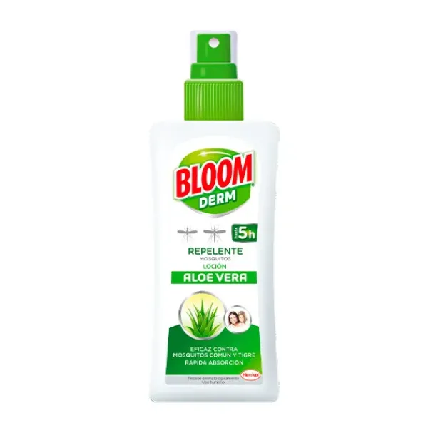 Bloom Derm Loción Aloe Vera, de rápida absorción gracias a su fórmula con icaridina, protege tu piel de manera eficaz contra mosquitos común y tigre hasta 5 horas. Producto testado dermatologicamente.