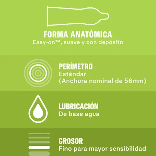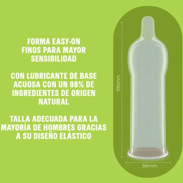 Anchura nominal de 56 mm, talla adecuada para la mayoría de los hombres gracias a su diseño elástico. Preservativos de látex suaves con forma anatómica Easy-On con depósito.