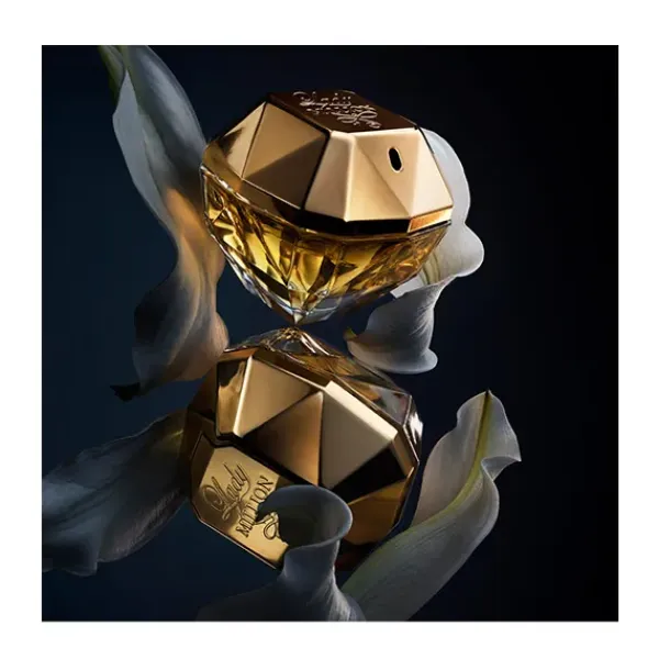 El frasco Lady Million está inspirado en los tejidos de Paco Rabanne. Un frasco elegante, redondeado y extremadamente femenino. Con un dorado un poco más suave que el masculino, el frontal metálico en relieve combina con un vidrio facetado con el objetivo de resaltar el jugo. Es la pareja perfecta para el lingote de 1 million: Un diamante dorado, fuerte y con una firma segura.