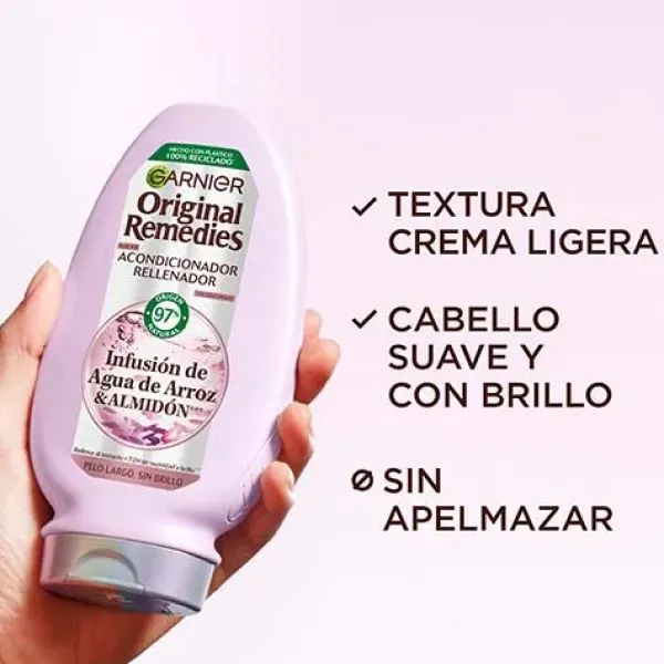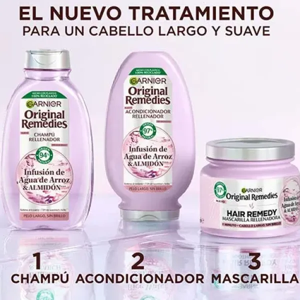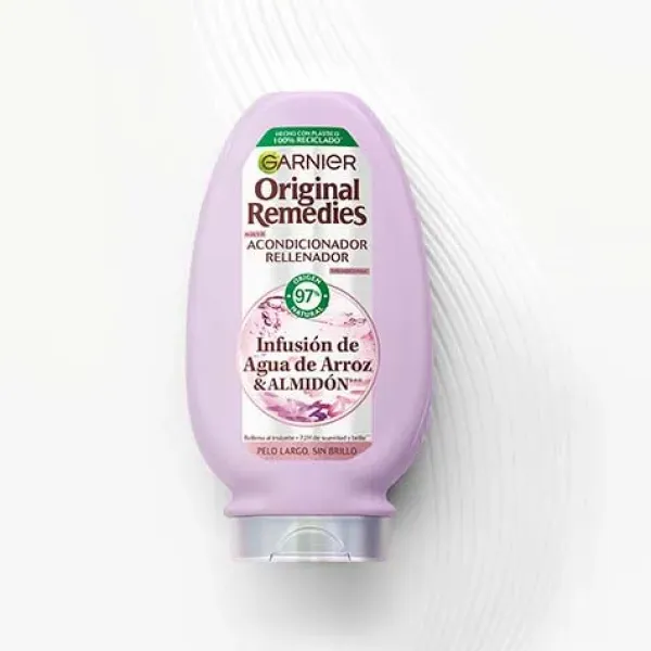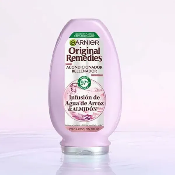 Garnier Original Remedies Acondicionador Rellenador con Infusión de Agua de Arroz, ideal para cabello largo y sin brillo.