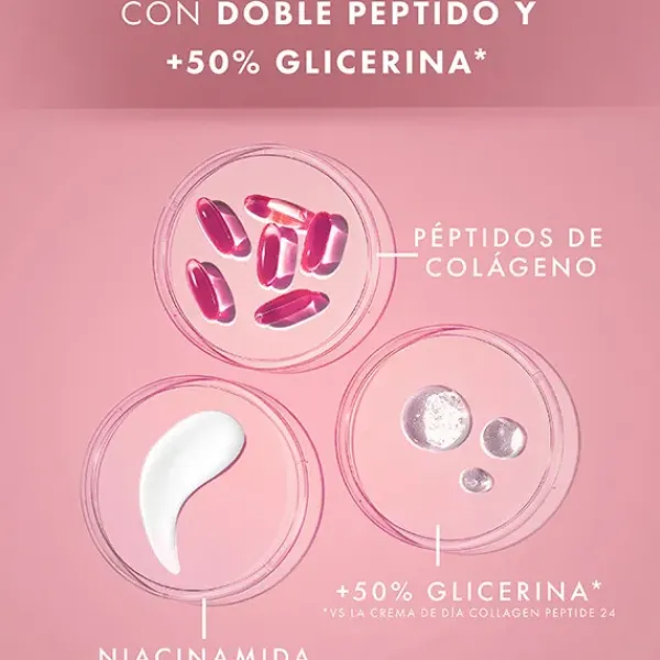 CREMA DÍA: Durante la menopausia, los niveles de colágeno empiezan a descender, lo cual hace que la piel esté seca y menos firme. Se ha demostrado que la crema de día Olay Collagen Peptide MAX combate los signos visibles de la menopausia y proporciona una piel hasta un 30% más fuerte**. Esta potente crema hidratante, elaborada con un 50% más* de ingredientes hidratantes y péptido de colágeno, reafirma la piel y ayuda a mejorar la apariencia de las líneas de expresión y las arrugas. Fórmula con la mayor concentración (entre los productos Olay) de niacinamida con una pureza del 99%, capaz de penetrar hasta 10 capas de profundidad en la superficie de la piel para ayudar a activar su renovación celular. Piel hidratada y elástica en solo 1 día. En 14 días, la firmeza y elasticidad de la piel se restauran visiblemente. en comparación con la crema de día Collagen Peptide basada en mejoras de la barrera de hidratación de la piel.