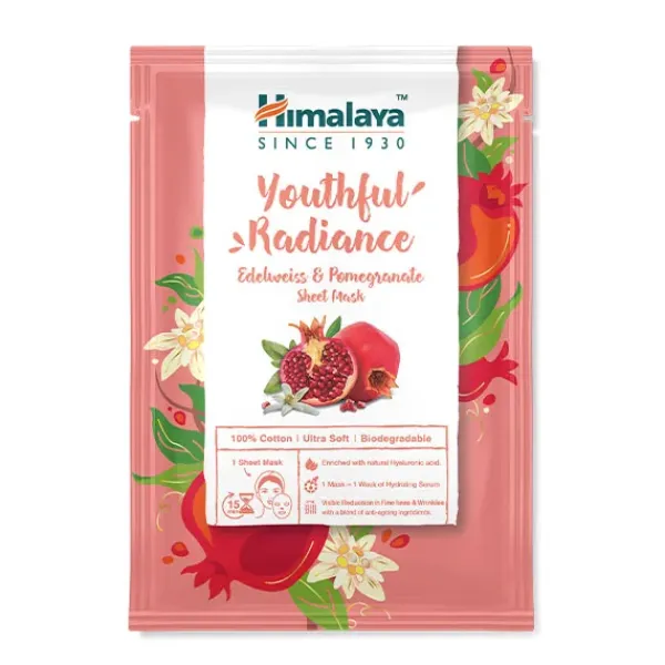 Hecha 100% de algodón, la Sheet Mask Juventud Resplandeciente de Edelweiss & Granada de Himalaya es ultra suave y cubre perfectamente tu rostro como una segunda piel