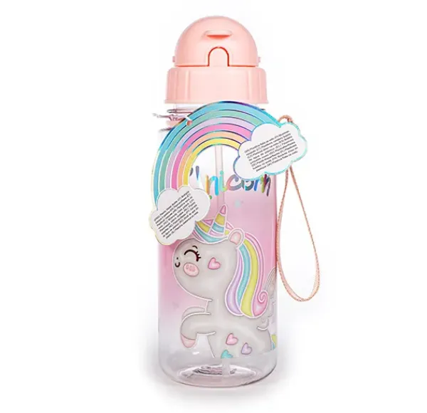 Botella de agua con bastón y asa. Estampado de unicornio. Etiqueta arcoíris. lámina holográfica