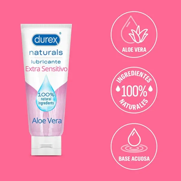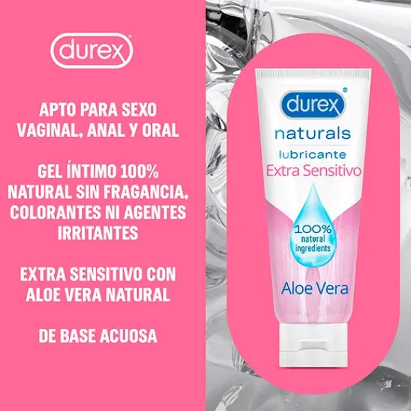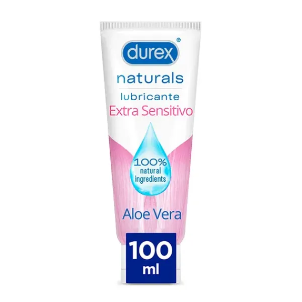 Durex Naturals Extra Sensitivo lubricante es un gel lubricante íntimo 100% natural que alivia la sequedad vaginal. Su fórmula de base acuosa es libre de fragancias y colorantes. Con Aloe Vera natural para sentir un sexo suave de forma natural.