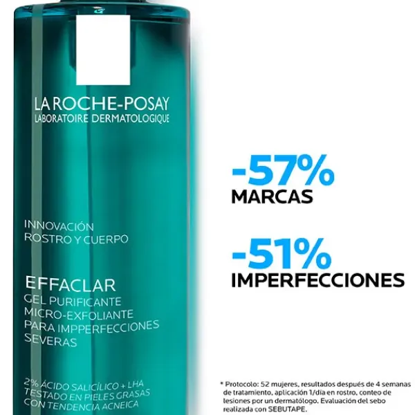 EFFACLAR Gel Purificante Micro-exfoliante de La Roche Posay favorece la eliminación de las células muertas sin irritar y ayuda a eliminar las impurezas y el exceso de sebo desobstruyendo los poros en profundidad.