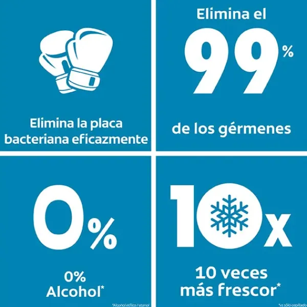 Enjuague bucal que elimina la placa bacteriana eficazmente, fortalece las encías hasta un 67% y proporciona un aliento freco y duradero.