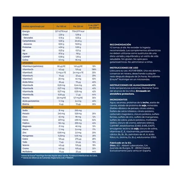 Ensure Nutrivigor es un complemento alimenticio con sabor a vainilla que contiene una fórmula exclusiva además de proteínas y vitamina D que contribuyen al mantenimiento de la masa muscular.
